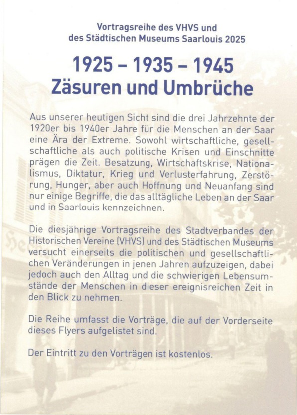 Die unterschiedliche historische, wirtschaftliche und gesellschaftliche Entwicklung ihrer Stadtteilen kennzeichnet die heterogene Struktur der heutigen Gesamtstadt Saarlouis. Die Stadtteile haben sich aufgrund verschiedener Ausgangslagen und Rahmenbedingungen durchaus sehr vielfältig ausgebildet und jeder Ort hat seine eigene, individuelle Geschichte. In Fortführung der im letzten Jahr begonnenen Betrachtung der Ortsgeschichte(n) werden erneut verschiedene Einzelaspekte dieser historischen Entwicklungen Themen der Vortragsreihe des Verbandes der Heimatkundlichen Vereine Saarlouis (VHVS) sein.