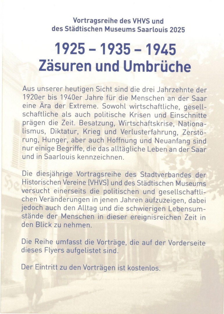 Die Reihe, die in Zusammenarbeit mit dem Städtischen Museums Saarlouis veranstaltet wird, umfasst folgende Vorträge: